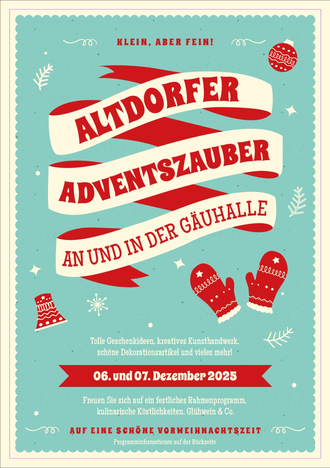 Am 6. und 7. Dezember 2025 findet in Altdorf wieder der stimmungsvolle Adventsmarkt um und in der Gäuhalle statt. Zahlreiche Aussteller mit kreativer Handwerkskunst, schönen Geschenkideen und herzlichen Angeboten freuen