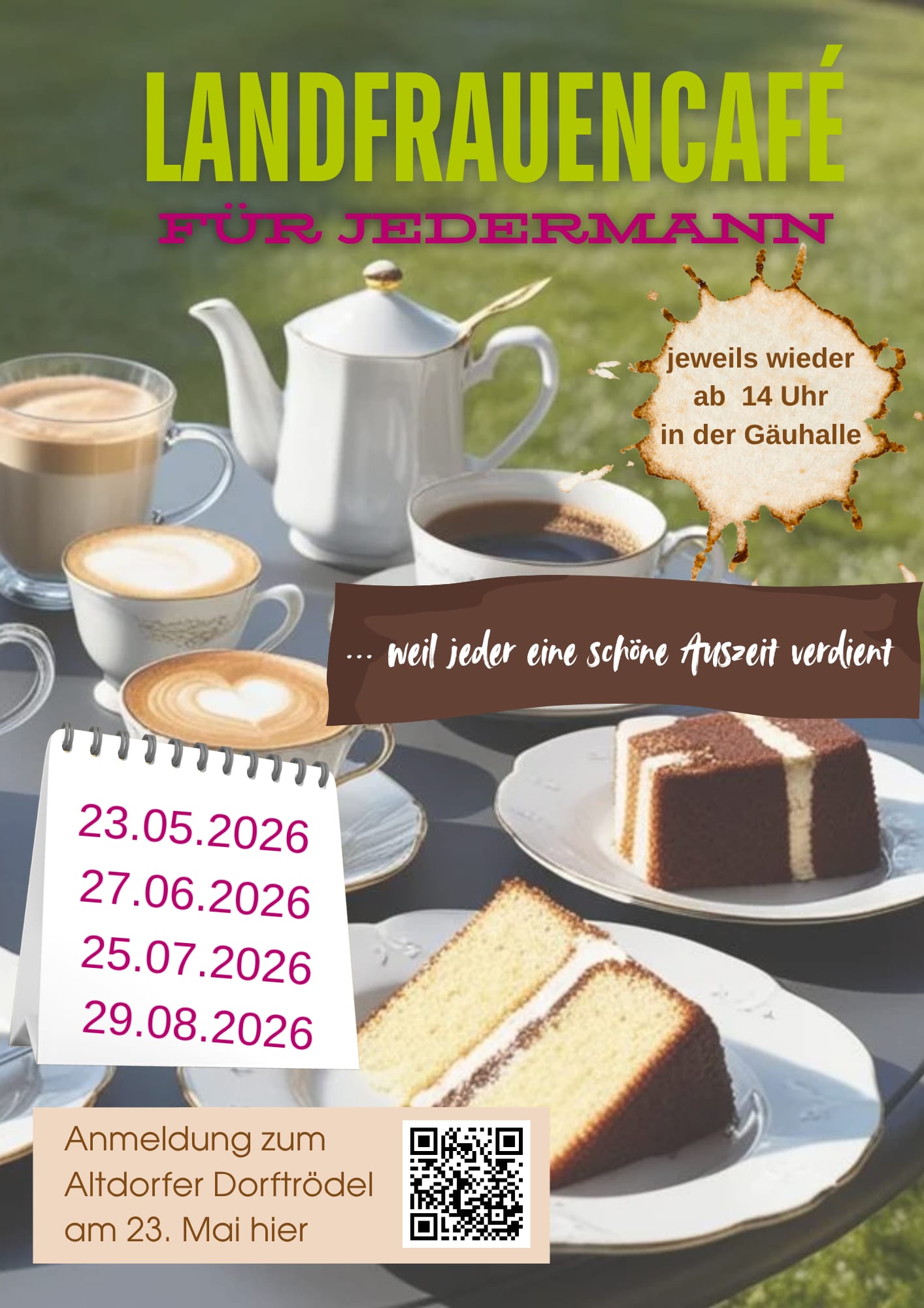 Die Landfrauen laden wieder zum Dorfcafé ein.An vier Terminen über den Sommer erwarten Sie Kaffee, hausgemachter Kuchen und eine schöne Auszeit.
