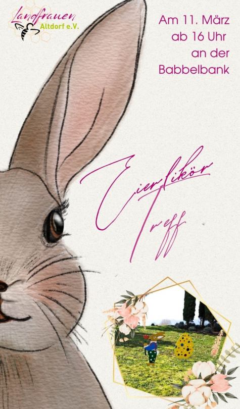 Die Landfrauen Altdorf/Pfalz e.V. laden ein zum „Eierlikörtreff“. Mittwoch, 11. März 2026 ab 16 Uhr an der „Babbelbank“ (hinter den Gärten zwischen Raiffeisenstraße und Landstraße). Gäste sind herzlich willkommen!